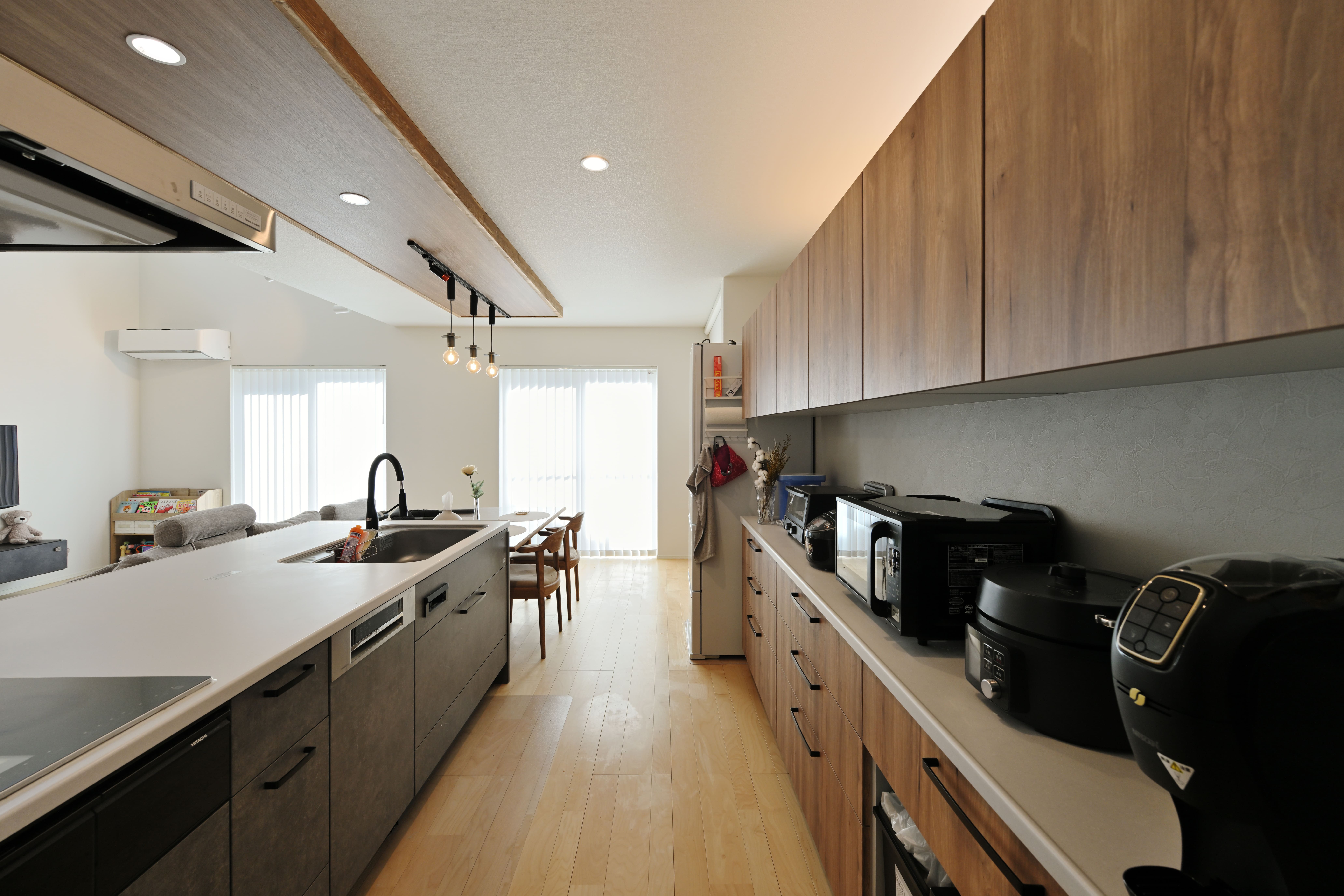 キッチンダイニングは横並びに。毎日の配膳や片付けが楽ちんになったとお施主様。ダイニングにはかわいらしいペンダントライトを。