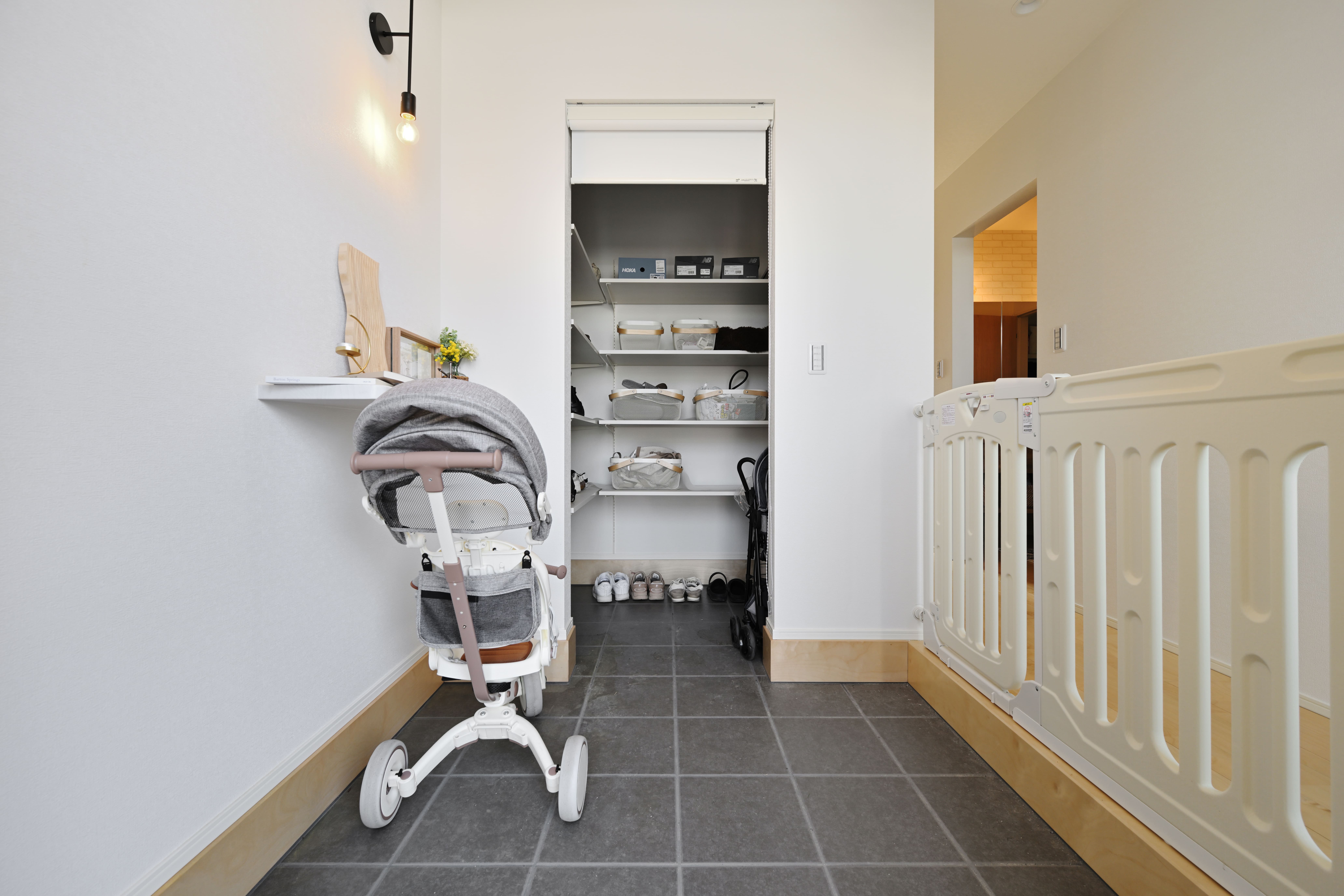 玄関にはシューズクロークを採用。ベビーカーを畳まずそのまま入れることができるので便利。わんちゃんのお散歩グッズなどもシューズクロークに収納できます。