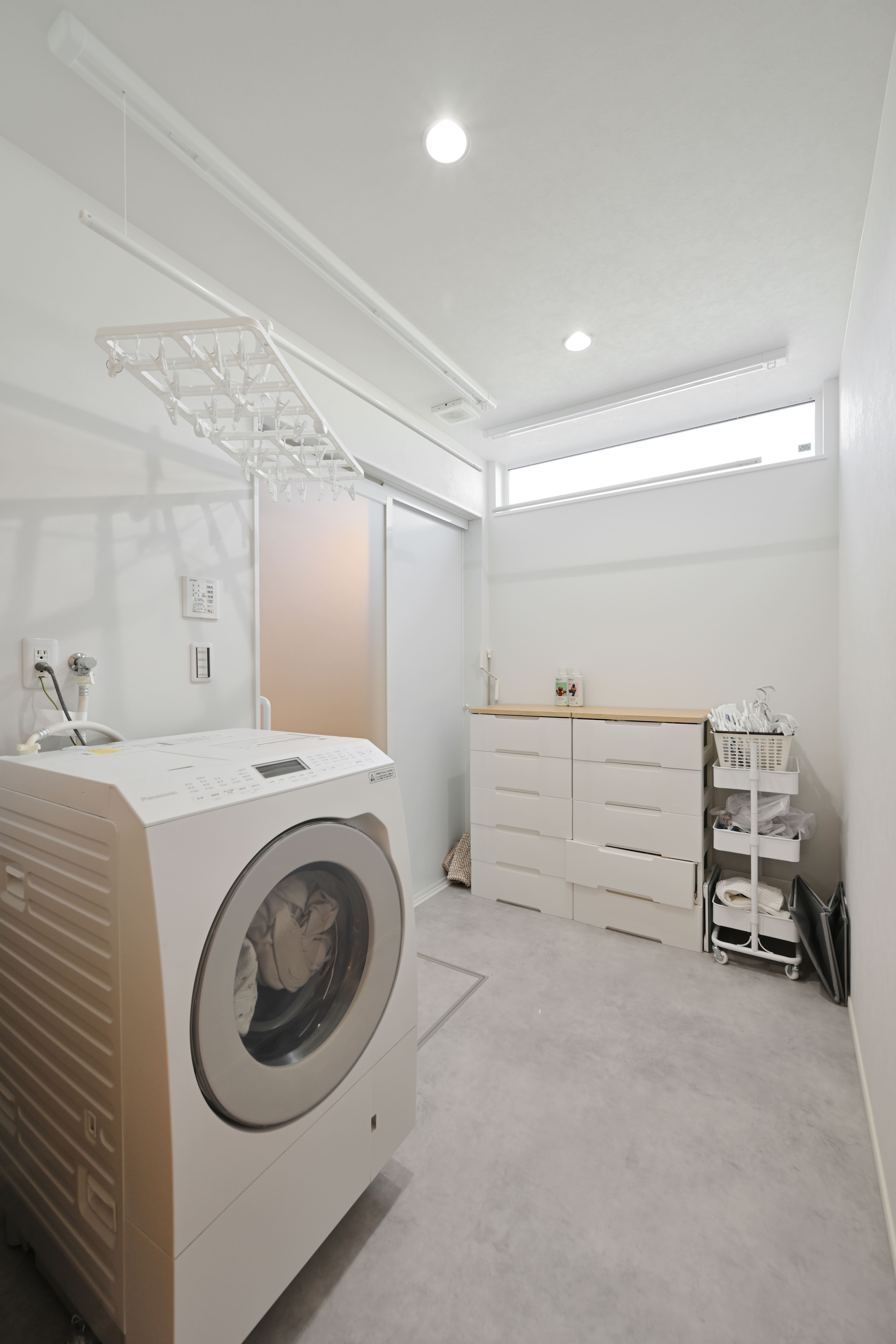3帖の脱衣室。室内干しできるように広めに脱衣室を確保。脱衣室からウォークインクローゼットまで5歩で収納でき便利◎